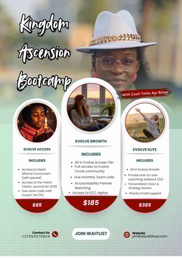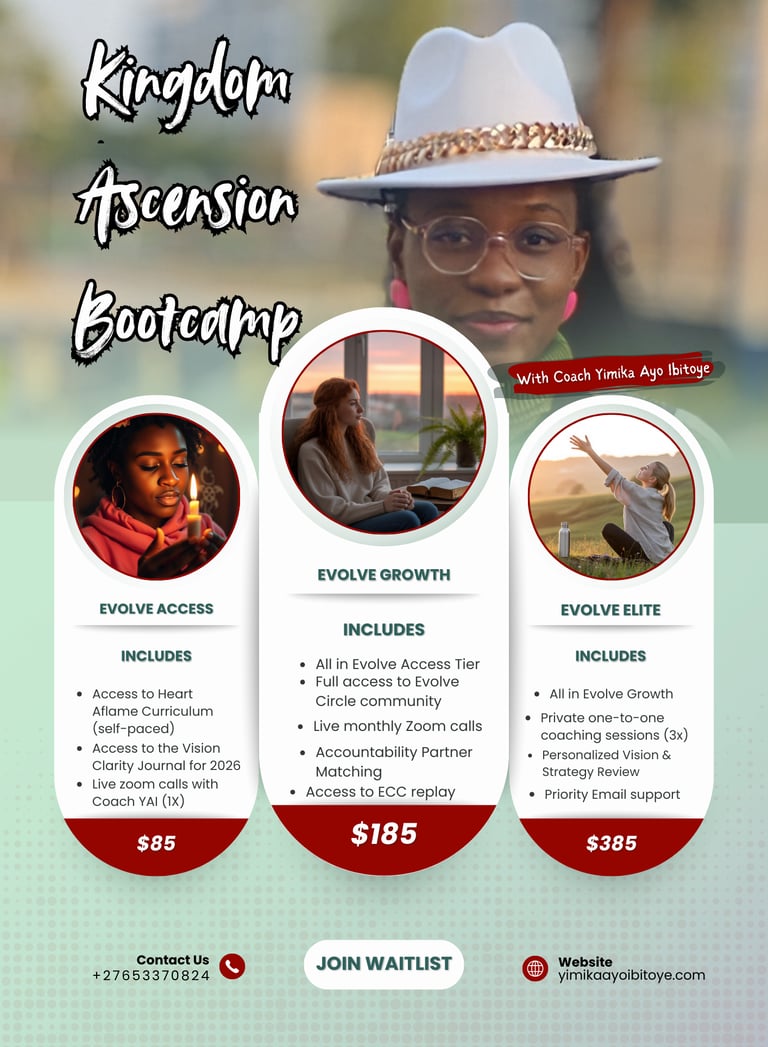 As a Kingdom voice, Spiritual midwife, and Life coach for women navigating transitions especially African women, home and diaspora, Yimika Ayo Ibitoye, helps women awaken their identity, align with divine rhythm, and amplify legacy, one season at a time.
